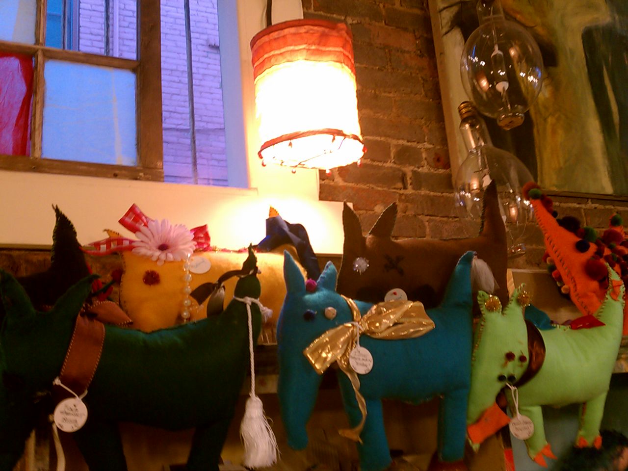We also made big changes to the lay out of the store. We re-thought the use of the gallery and moved fabric and paper packages and scraps into the space. Below is a picture of some of the fabric and fiber. I owe you a picture of the paper section. There are project ideas hanging from the beams to inspire the crafter in all.